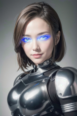 (photorealistic:1.4), (RAW photo), masterpiece, best quality, extremely detailed, lady, cyborg, mechanical, metallic silver body, metallic silver armor, metallic silver boots, metallic silver gloves, almond shaped eyes, beautiful eyes, staring, smile, <lora:brighter-eye1:1>,