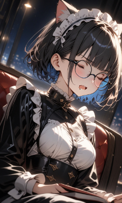 Thin-rimmed glasses , maid headdress, black patent leather bolero, high neck,short puff sleeves, black patent leather corset, flare skirt, white waist apron, white cuffs,