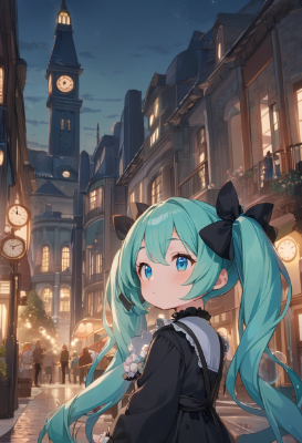 masterpiece, best quality, extremely detailed, anime, girl, skirtHatsune Miku, vocaloid, gothic, 1 girl, twin tails, long hair, blue hair, green hair, blue eyes, hair bow, clock tower town, night,twintail,longhair,soundly,my child,PastelCalla,soapbubbles,flower,city