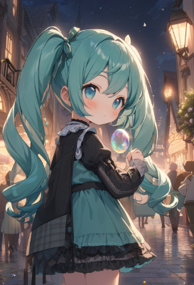 masterpiece, best quality, extremely detailed, anime, girl, skirtHatsune Miku, vocaloid, gothic, 1 girl, twin tails, long hair, blue hair, green hair, blue eyes, hair bow, clock tower town, night,twintail,longhair,soundly,my child,PastelCalla,soapbubbles,flower,city