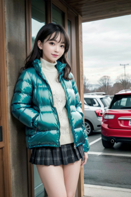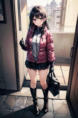 (photorealistic:1.4), (RAW photo), masterpiece, best quality, extremely detailed, lady, white ruffle mini skirt, pink leather long gloves, shiny black down jacket, long boots, long hair, almond shaped eyes, staring, standing, midnight, quiet residential area,