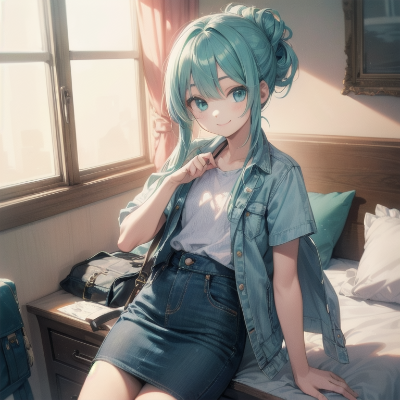 masterpiece, best quality, highres, 1otoko no ko, solo, black bikini with Geometric pattern, sarong, flip flops, かわいい, flat chest, aqua hair, aqua eyes, half updo, smile, 16 yo, nice hands, perfect hands, surfing<lora:flat2:0> <lora:hairdetailer:0.5><lora:GoodHands-vanilla:1>
