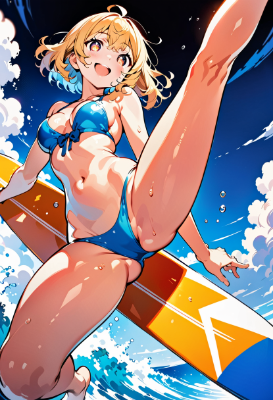 masterpiece, best quality, great, highly detailed CG unity 8k wallpaper, depth of field, (super fine illustration:1.5), illustration, CG, 2D, (Anime Style:1.2), extremely detailed 1 girl surfing, full body, arched back, stand on a surfboard, from front, (from below), looking up, extremely detailed face, kawaii, happy smile, open mouth, (light pink lips: 0.8), short bob cut hair, (gold hair), (light-orange eyes:1.2), detailed eyes, sparkling eyes, cute face, kawaii, medium breasts, slender body, slender legs, delicate hair, disheveled hair, shiny hair, shiny skin, nice hands, spread both hands, bikini, nice hip, daylight, blue sky, on the big wave, splash of water, light and shadow, (very wide shot), wet, <lora:hohoaka:0.7> <lora:saturation:0.55> <lora:eyecolle_artemisia_v100:0.7> <lora:flat2:0.3>