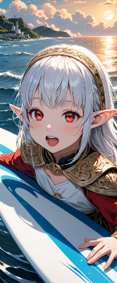 8K,(((masterpiece,best quality,Ultra extremely detailed,perfect anatomy,detailed))),((close-up face from_above:1.5,surfing child elf on sea)),wolf_cat white hair,(looking at viewer),(opening mouth:1.5),smile,blush,lipstick,full fresh lips,big hip,((Eye Reflections, reflect strong highlight in eyes, detailed_red_eyes,solo,sleeping_child_elf:2,hairband,wave shining white hair,BREAK,moon,many flowers,clouds,town_of_fortress_in_distance,birds,<lora:hairdetailer:1> <lora:make25d_type1_v100:1>,