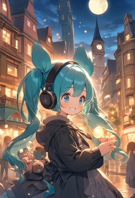 masterpiece, best quality, extremely detailed, anime, girl, skirtHatsune Miku, vocaloid, tie, 1girl, twin tails, long hair, blue hair, green hair, blue eyes, headphones, clock tower town, night, full moon, starry sky,twintail,longhair,smile,city,fantasy,magic,my child,colorful,soapbubbles,Lollipop,PastelCalla,GothicLolita