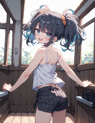 score_9, score_8_up, score_7_up, source_anime, POV, Looking At Viewer, Claw Pose, standing, solo, 1girl, Medium Hair, Single Braid, Rainbow Hair, smile, Jacket, Denim Shorts, black cat, Dirt Road, <lora:flat_sdxl:-0.5>, <lora:crouching_pony_V1.0:0.8>, crouching, rounding the back