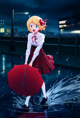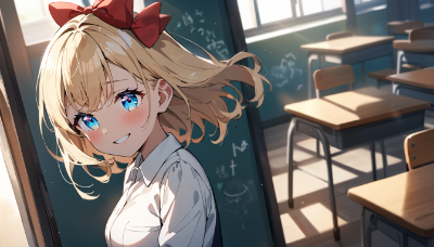 1girl,(anime style:1.2),blonde hair,blue eyes,short hair,( hair bow:1.4),red bow,young,teen,flat chest,thoughtful expression,(looking to the side:1.3),(contemplative:1.4),school uniform,white blouse,blue skirt,red neckerchief,indoors,bedroom,(corner of room:1.2),desk,chair,bookshelf,window,curtains,(soft sunlight:1.1),standing,hands clasped,leaning against wall,head slightly tilted,(pensive atmosphere:1.3),beautiful detailed eyes,long eyelashes,(light reflections in eyes:1.1),smooth shading,pastel colors,clean lines,depth of field,(bokeh effect:1.1),(nostalgic mood:1.2),(emotional:1.3),cherry blossom petals floating outside window,school bag on floor,open book on desk,(clock on wall:1.1),(soft shadows:1.2),(masterpiece:1.4),(best quality:1.4),(very aesthetic:1.3),(absurdres:1.3),.4,