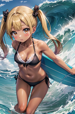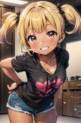 <lora:flat2:-0.5>,<lora:beautiful_detailed_eyes:0.5>,<lora:skin_tone_slider_v1:3.5>,<lora:noribs_v11:1.3>,(anime screencap:1.1),(kawaii:1.3),very cute and beautiful teenage,(petite stature:1.5),(blonde short twintails:1.3),blunt bangs,(drooping brown eyes:1.2),(medium breasts:1.3),cleavage,t-shirt,short sleeve hoodie,denim shorts,smile,grin,leaning forward,peer in viewer,from below,nose blush,