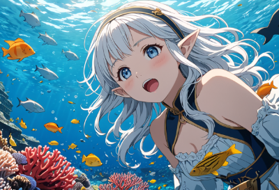 8K,(((masterpiece,best quality,Ultra extremely detailed,perfect anatomy,detailed,anime screencap,animated painting))),((cowboy shot face, from_below:1.5,hold-up Child elf underwater)),wolf_cat white hair,(looking at viewer),(opening mouth:1.5),smile,blush,lipstick,full fresh lips,big hip,((red_Eye:1.5, Eye Reflections, reflect strong highlight in eyes, solo,hairband,wave shining white hair,cute_ClothSwinming_dress,BREAK,coral reef,many fishes,many flowers,clouds,town_of_fortress_in_distance,<lora:hairdetailer:1> <lora:make25d_type1_v100:1>,,,,,,