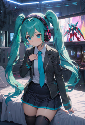 masterpiece, best quality, extremely detailed, anime, girl, skirt,Hatsune Miku, VOCALOID, necktie, 1 girl, twin tails, long hair, blue hair, green hair, blue eyes, headphones,twintail,longhair,animated painting,cyberroom,mini skirt,cyberpunk,mecha,bed,science fiction,fantasy