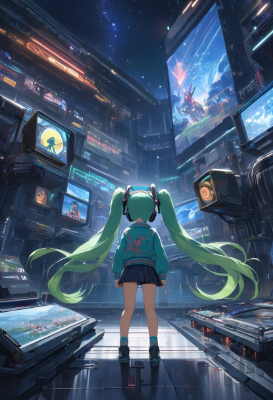 masterpiece, best quality, extremely detailed, anime, girl, skirt,Hatsune Miku, VOCALOID, necktie, 1 girl, twin tails, long hair, blue hair, green hair, blue eyes, headphones,twintail,longhair,animated painting,cyberroom,mini skirt,cyberpunk,mecha,science fiction,fantasy,my child,space,night,starry sky