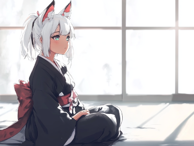 anime, crayon drawing, silent happy, daydream, crystal art, stress world, path towards hole, dawn of the world, curiosity bells waiting, Japanese festival, killer queen, beautiful cool dark-skinned girl, white japanese miko clothes, silk texture, black undershirt, white hair, fox ears, thick eyebrows, sideway glance, imaginary lighting, colorful background,