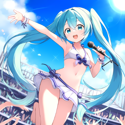 best quality,loli, hatsune miku, vocaloid,anime, swimsuit, stage, outdoors, sun,singing, audience, gochuumon wa usagi desu ka?, smile, jumping, Raise your hand, medium breasts, best quality, amazing quality, very aesthetic, absurdres