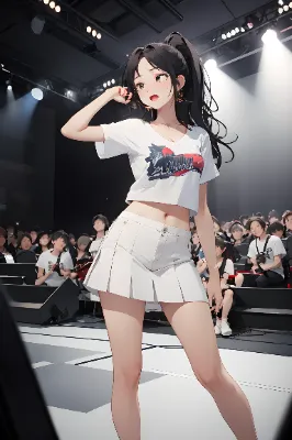 T shirts,white miniskirt,white shoes,only white clothing,black eyes,very tall,idol,kpop,original character,my child,crying very very very well,standing on the stage,music program studio,full audience, <lora:deluster1:1> <lora:eyecolle_platanus_v100:1>