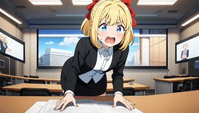 1girl,solo,(blonde hair:1.2),short hair,(blue eyes:1.1),(hair bow:1.4),(red bow:1.1),loli,(school uniform:1.2),white sailor collar,blue skirt,(classroom:1.2),(desks:1),(chalkboard:1.1),(windows:0.9),(daytime:1),(raised hand:1.3),(standing pose:1.1),(leaning forward:1.1),(eager expression:1.2),(open mouth:1.1),(sparkling eyes:1.1),(full body:1),(school bag:0.9),(textbooks:0.8),(pencil case:0.8),(other students:0.7),(teacher's desk:0.9),(posters on wall:0.8),(clock:0.8),(sunlight through windows:1),dynamic pose,energetic,(school atmosphere:1.1),(question mark:0.9),(thought bubble:0.8),(masterpiece:1.4),(best quality:1.3),(very aesthetic:1.2),(absurdres:1.1),
