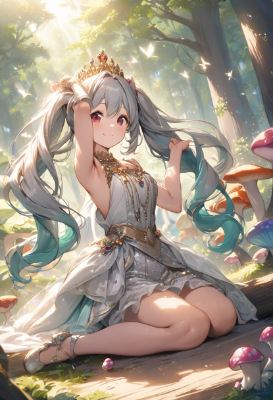masterpiece, best quality, extremely detailed, anime, girl, skirtIllustration of Hatsune Miku, VOCALOID, 1 girl, twin tails, long hair, silver hair, gray hair, red eyes, elf, brown skin, in the woods, sitting on a stump, fairy, colorful mushrooms, soap bubbles, sunlight filtering through the trees, a royal girl. The characters wear luxurious and delicate dresses, and wear tiaras adorned with crowns and jewels on their hair. The dress has a noble design based on gold and white, and is studded with fine embroidery and jewels. She has a graceful smile and poses gracefully. In the background, a splendid room in the royal palace spreads out, and the overall scene exudes elegance and elegance.