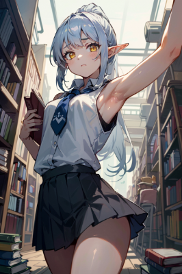 girl,shorthair,blue hair,red eyes,Armpit,elf,schoolgirl,original character,perspective,cyberpunk,summer,day,different world,library(The sight of an elven high school girl stretching her back to pick up a book and showing a glimpse of her armpits from under her uniform is incredibly seductive and alluring.)