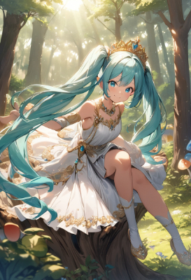 masterpiece, best quality, extremely detailed, anime, girl, skirtIllustration of Hatsune Miku, VOCALOID, 1 girl, twin tails, long hair, silver hair, gray hair, , elf, brown skin, in the woods, sitting on a stump, fairy, colorful mushrooms, soap bubbles, sunlight filtering through the trees, a royal girl. The characters wear luxurious and delicate dresses, and wear tiaras adorned with crowns and jewels on their hair. The dress has a noble design based on gold and white, and is studded with fine embroidery and jewels. She has a graceful smile and poses gracefully. In the background, a splendid room in the royal palace spreads out, and the overall scene exudes elegance and elegance.,Armpit,red eyes