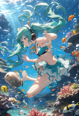 masterpiece, best quality, extremely detailed, anime, girl, Hatsune Miku, vocaloid, tie, 1girl, twin tails, long hair, , blue hair, green hair, blue eyes, one piece dress, headphones, sea, underwater, water bubbles, tropical fish, coral reef, sunken ship,bikini swimwear,soap bubbles,twintail,longhair,Armpit,fairy,fantasy,colorful