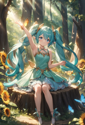 masterpiece, best quality, extremely detailed, anime, girl, skirtHatsune Miku, VOCALOID, 1girl, twin tails, long hair, blue hair, green hair, blue eyes, fairy princess, dress, in the woods, sunlight filtering through the trees, elf, sitting on a stump, sunflower,Armpit,fantasy,magic,butterfly,forest