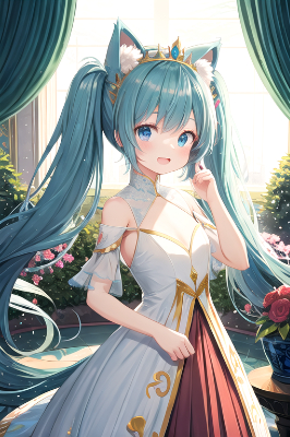 Illustration of Hatsune Miku, VOCALOID, 1girl, twin tails, long hair, blue hair, green hair, blue eyes, and a princess with cat ears. The character is a princess in a gorgeous dress with cute cat ears on her head. The dress has an elegant design with gold and pink embroidery, and it spreads softly as she moves. She has a graceful smile on her face and holds a small cat's tail with one hand. The background is a gorgeous castle interior and garden, and the overall scene combines fantasy and cuteness. , Illustration of a royal girl. The characters wear luxurious and delicate dresses, and wear tiaras decorated with crowns and jewels on their hair. The dress has a noble design based on gold and white, and is studded with fine embroidery and jewels. She has a graceful smile and poses gracefully. In the background, a splendid room in the royal palace spreads out, and the overall scene exudes elegance and elegance.