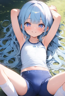 ,masterpiece, super fine illustration, super detailed skin, 1 , petite, , pigtails,white gym clothes, sleeveless, white short socks, blue japanese bloomers, sports shoes, outdoors, lawn, arms up, armpits, spread legs, standing,(SPORT wear)、school gym buruma