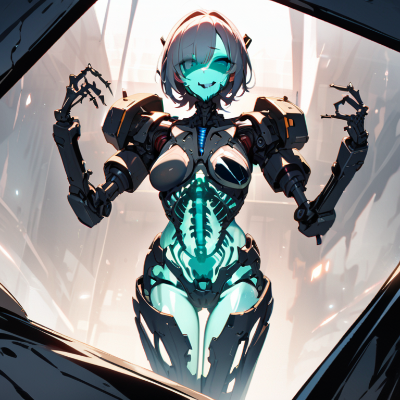 masterpiece,best quality,extremely detailed,(Gravure magazine back cover style:1.3),1girl,cyborg,teenager,curvy,evil_smile,stylish_pose,(Her entire body is transparent glass, and the skeletal parts of the machinery inside her body are visible through it:1.5),