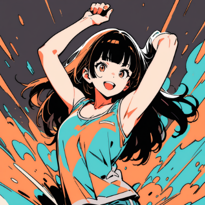 ((masterpiece, best quality, extremely detailed, absurdres)), perfect artwork, professional illustration, anime, BREAK, (a girl, (long black hair, blunt bangs, beady round brown eyes):1.3), cheerful smile, wearing t-shirt,