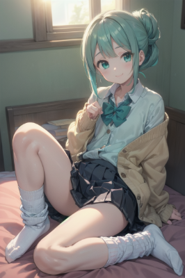 masterpiece, best quality, highres, 1otoko no ko, denim jacket, Denim skirt, no shoes, no socks, かわいい, flat chest, aqua hair, aqua eyes, half updo, 16 yo, nice hands, perfect hands, gummies on the table, eating Gummy, living room, sitting on the sofa<lora:flat2:0><lora:hairdetailer:0.5><lora:GoodHands-vanilla:1>