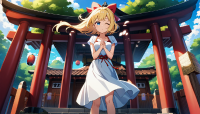 1girl,solo,(blonde hair:1.2),short hair,(blue eyes:1.1),(hair bow:1.1),(red bow:1.1),(anime style:1.3),young,teenage,medium breasts,(casual outfit:1.1),(summer dress:1.1),(floral pattern:1),(sandals:0.9),(standing pose:1.2),(praying pose:1.3),(hands clasped:1.2),(eyes closed:1.1),(hopeful expression:1.2),(full body:1.1),(lottery ticket:1.3),(shinto shrine:1.3),(torii gate:1.2),(stone steps:1.1),(wooden shrine building:1.2),(paper lanterns:1),(omikuji stand:1.1),(sacred tree:1),(shimenawa rope:1),(ema plaques:0.9),(incense smoke:0.9),(shrine maidens:0.8),(visitors:0.7),(dynamic pose:1.1),(wind:1.1),(hair flowing:1),(ribbon fluttering:1),(dress swaying:1),(dappled sunlight:1.1),(lens flare:0.9),(soft shadows:1),(detailed shrine architecture:1.1),(stone lanterns:0.9),(cherry blossom petals:1),(koi pond:0.8),(traditional Japanese elements:1.2),(summer day:1.1),(blue sky:1),(fluffy clouds:0.9),(distant mountains:0.8),(lush greenery:1),(serene atmosphere:1.2),(spiritual:1.1),(wishful thinking:1.2),(hope:1.2),(fortune seeking:1.1),(traditional Japanese culture:1.2),(cute:1.1),(innocent:1),(detailed background:1.1),(masterpiece:1.4),(best quality:1.3),(very aesthetic:1.2),(absurdres:1.1),