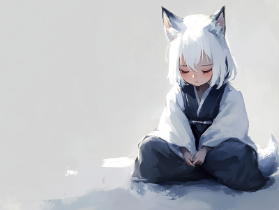 anime, crayon drawing, silent happy, daydream, crystal art, stress world, path towards hole, dawn of the world, curiosity bells waiting, Japanese shrine, killer queen, beautiful cool dark-skinned girl, white japanese miko clothes, silk texture, black undershirt, white hair, fox ears, thick eyebrows, sideway glance, simple background, white background,