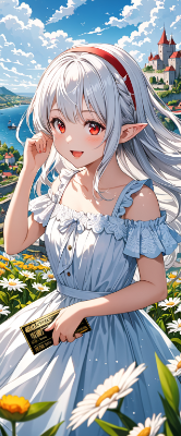 8K,(((masterpiece,best quality,Ultra extremely detailed,perfect anatomy,detailed))),((lottery, cowboy shot, from_side:1.5,arms-up, Child elf holding Gummies, blueberries)),wolf_cat white hair,(looking at viewer),(opening mouth:1.5),smile,blush,lipstick,full fresh lips,big hip,((red_Eye:1.5, Eye Reflections, reflect strong highlight in eyes)), solo,hairband,wave shining white hair,cute_summer_dress,BREAK,garden,many bills, many Gummies, blueberries,many flowers,clouds,town_of_fortress_in_distance,<lora:hairdetailer:1> <lora:make25d_type1_v100:1>,,,