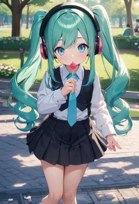 masterpiece, best quality, extremely detailed, anime, girl, skirt,hatsunemiku,VOCALOID,tie,headphone,mini skirt,twintail,longhair,blue hair,green hair,blue eyes,park,flower,clear sky,my child,Lollipop,Candy,chocolate,PastelCalla,Gummy,smile