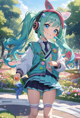 masterpiece, best quality, extremely detailed, anime, girl, skirt, hatsunemiku, vocaloid, tie, headphone, mini skirt, twintail, longhair, blue hair, green hair, blue eyes, park, flower, clear sky, my child, lollipop, candy, chocolate, pastelCalla, gummy, smile, colorful, butterfly, 1 girl, twin tails, long hair, elf, blue hair, green hair, blue eyes, beautiful spring, fantastic, fog, soap bubbles