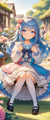 masterpiece, best quality, extremely detailed, anime, girl, skirt,blue hair,blue eyes,princess,dress,maid,light pink color waitress uniform,white stockings,pumps,gradation,bobcut,Makeup,different world,garden <lora:noline:1> <lora:hairdetailer:1> <lora:hime_style-1.0r8:1> <lora:sanDka2:1>,wolf cut,starry sky