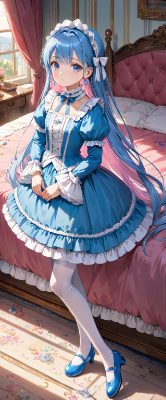 masterpiece, best quality, extremely detailed, anime, girl, skirt,blue hair,blue eyes,princess,dress,maid,light pink color waitress uniform,white stockings,pumps,gradation,bobcut,Makeup,smile,wink,different world,garden <lora:noline:1> <lora:hairdetailer:1> <lora:hime_style-1.0r8:1> <lora:sanDka2:1>