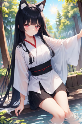 girl,ahoge,purple hair,red eyes,morning sun,fox girl,shrine en,original character,shrine maiden,foreshortening,steampunk,summer,blue sky,flower,mountain,forest,clear sky(How bewitching and beautiful is the beautiful fox maiden bathing in the morning sun in the shrine grounds.)