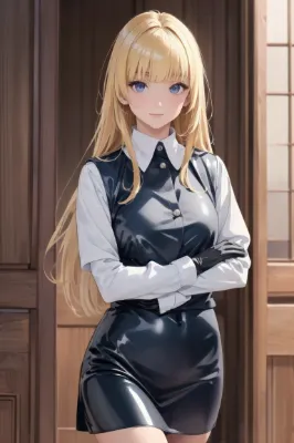 (photorealistic:1.4), (RAW photo), masterpiece, best quality, extremely detailed, lady, office clerk, company employee, neat and clean, elegant, polite, (enamel, latex, rubber:1.3), white blouse, navy vest, tight skirt, leather gloves, knee high boots, almond shaped eyes, drooping eyes, cold gaze, staring, fearless smile, <lora:hime_style-1.0r8:0.8>,