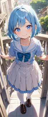 masterpiece, best quality, extremely detailed, anime, girl, skirt,blue hair,blue eyes,princess,lolita,light pink color sailor uniform,white stockings,loafer,gradation,bobcut,vaion,Makeup, ,wink,smile,my child, ,balcony <lora:noline:1> <lora:hairdetailer:1> <lora:hime_style-1.0r8:1> <lora:sanDka2:1>