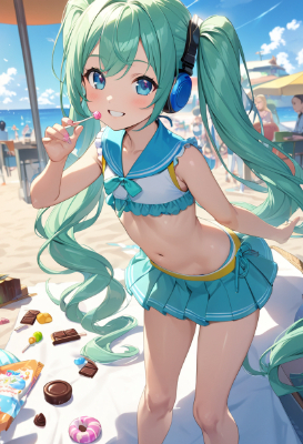 masterpiece, best quality, extremely detailed, anime, girl, skirt,hatsunemiku,VOCALOID,tie,headphone,mini skirt,twintail,longhair,blue hair,green hair,blue eyes,clear sky,my child,Lollipop,Candy,chocolate,PastelCalla,smile,colorful,smile,morning sun,summer,sea,beach,blue sky,bikini swimwear,fantasy,older sister