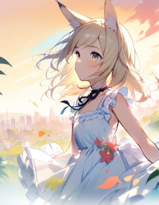 1girl, [satono diamond \(umamusume\)::2],[blue archive:1:5],partial upper body,solo,[(preteen female,dainty body type:1.3):1:15],[blonde hair:1:10],pleated skirt, lolita fashion,summer dress, [neck ribbon:1],[(action ,dynamic angle,wind:0.6)::2],[light smile::0.5],[(expressionless mouth:1.2)::10],[(pink hair:0.6)::5],masterpiece, best quality,BREAK,,,,[outdoors,scenery,city,dusk,gradient sky:1],[(croquis:1.2):0.5],[photographic background, pictorialism, aerial perspective,foreshortening:5],[(sketch:1.2):0.5],[(unfinished:1.2):0.5],[(sunken body:0.9),( slender:1.2)::3],[(fox ears,Medium hair:1.2)::10],BREAK,,,,profile,standing at attention,Dead-on side view,
