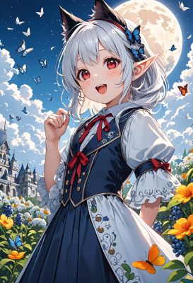 8K,(((masterpiece,best quality,Ultra extremely detailed,perfect anatomy,detailed))),((cowboy shot, from_below:1.5,Child elf head tilt ,pointing mouth, blueberries,pompons)),wolf_cat white hair,(looking at viewer),(opening mouth:1.5),smile,blush,lipstick,full fresh lips,big hip,((red_Eye:1.5, Eye Reflections, reflect strong highlight in eyes)), solo,hairband,wave shining white hair,cute_formal_suit_dress,BREAK,moon, garden,butterfly,many birds, many Gummies, blueberries,many flowers,clouds,city_of_fortress_in_distance,<lora:hairdetailer:1> <lora:make25d_type1_v100:1>,,,