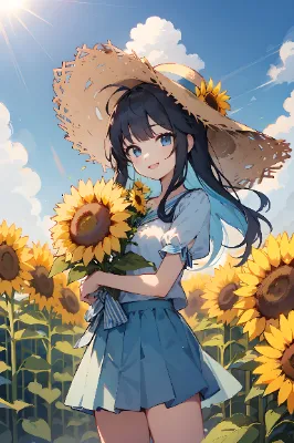 masterpiece, best quality, extremely detailed,1girl,hold a bouquet of sunflower in both hands,short sleeve,puff sleeve,onepiece,mini skirt,straw hat,forehead sticking out,longhair,black hair,idol,kpop,ojou-sama,standing,smiling,original character,my child,colorful,day,clear sky,blue sky,sunshine,sunlight,summer,sunflower,flower,garden, <lora:deluster1:1> <lora:eyecolle_lemon_v100:1>