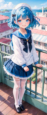 masterpiece, best quality, extremely detailed, anime, girl, skirt,blue hair,blue eyes,princess,lolita,light pink color sailor uniform,white stockings,loafer,gradation,bobcut,vaion,Makeup, ,wink,smile,my child,wolf cut, <lora:noline:1> <lora:hairdetailer:1> <lora:hime_style-1.0r8:1> <lora:sanDka2:1>,balcony