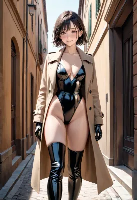 (photorealistic:1.4), (RAW photo), masterpiece, best quality, extremely detailed, lady, black enamel leotard, knee high boots, gloves, (beige trench coat:1.2), almond shaped eyes, drooping eyes, staring, smile, shy look, embarrassed, <lora:hime_style-1.0r8:0.8>,