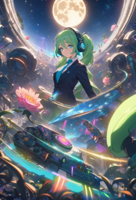 masterpiece, best quality, extremely detailed, anime, girl, ,hatsunemiku,VOCALOID,Headphones,tie,blue hair,green hair,blue eyes,twintail,longhair,suit,boss,colorful,fantasy,city,park,flower,magic,space,starry sky,full moon,cyberpunk,machine,science fictionp,smile