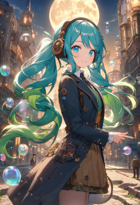 masterpiece, best quality, extremely detailed, anime, girl, ,hatsunemiku,VOCALOID,Headphones,tie,blue hair,green hair,blue eyes,twintail,longhair,suit,colorful,fantasy,machine,p,smile,PastelCallasuit,soap bubbles,park,city,steampunk,ruins,flower,night view,starry sky,full moon