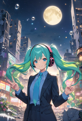 masterpiece, best quality, extremely detailed, anime, girl, ,hatsunemiku,VOCALOID,Headphones,tie,blue hair,green hair,blue eyes,twintail,longhair,suit,p,smile,PastelCallasuit,soap bubbles,ruins,flower,night view,starry sky,full moon,<lora:gunAimingAtYouV1:1>, gunatyou
