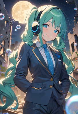 masterpiece, best quality, extremely detailed, anime, girl, ,hatsunemiku,VOCALOID,Headphones,tie,blue hair,green hair,blue eyes,twintail,longhair,suit,p,smile,PastelCallasuit,soap bubbles,ruins,flower,night view,starry sky,full moon,, gunatyou,military <lora:gunAimingAtYouV1:1>