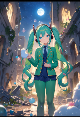 Hatsune Miku, VOCALOID, illustration of a girl with chemo ears. The characters have cute animal ears growing on their heads, and their bushy tails are also characteristic. She has an energetic and cheerful expression and is dressed casually and cutely. Lush forests and flower fields spread out in the background, and there is a scene where the innocent and adorable atmosphere of a chemo-eared girl who lives with nature drifts through the air. Hold my teddy bear, my child